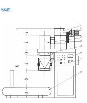 1.進料口 2.絞龍電機 3.控制器 4.給料器 5.除塵罩 6.夾袋式電子秤 7.電控柜 8.輸送縫包系統(tǒng)